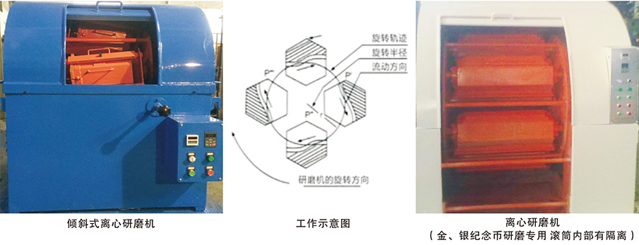 置四個滾筒(四個研磨槽)或六個滾筒,滾筒即隨圓盤高速旋轉和自轉的相對運動,從而得到了滾筒中零件和磨料、水、